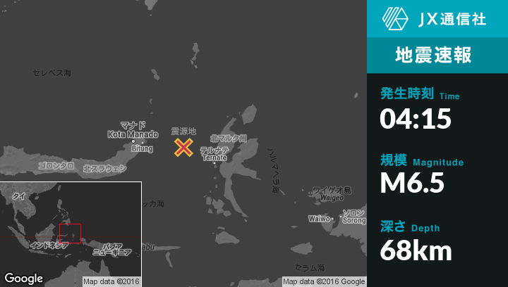 震源地インドネシアのKota Ternateから西北西127kmの地点