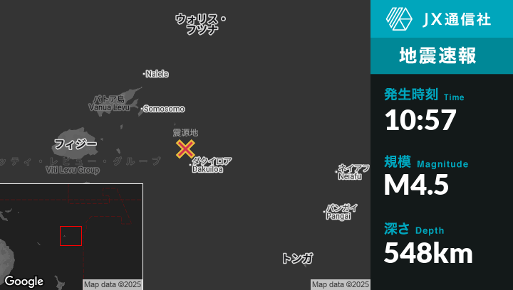 12月03日 10:57頃、フィジーのLevukaから東217kmの地点でM4.5の地震がありました。