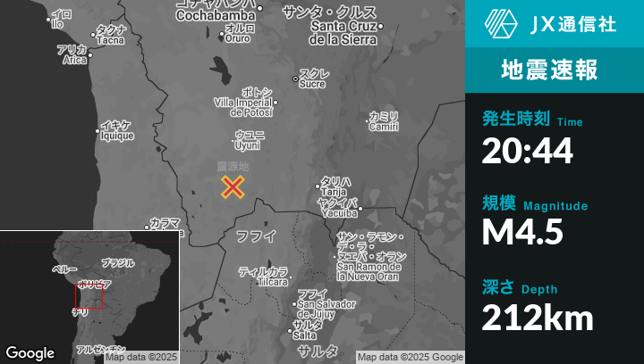 11月28日 20:44頃、ボリビアのAtochaから南西81kmの地点でM4.5の地震がありました。