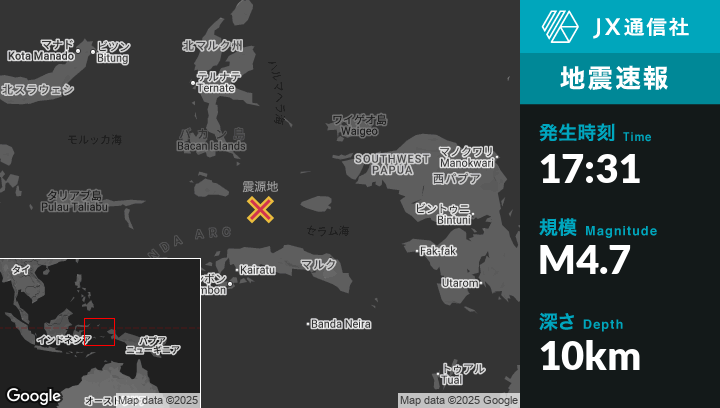 | 震源地 | インドネシアのMasohiから北156kmの地点 |
