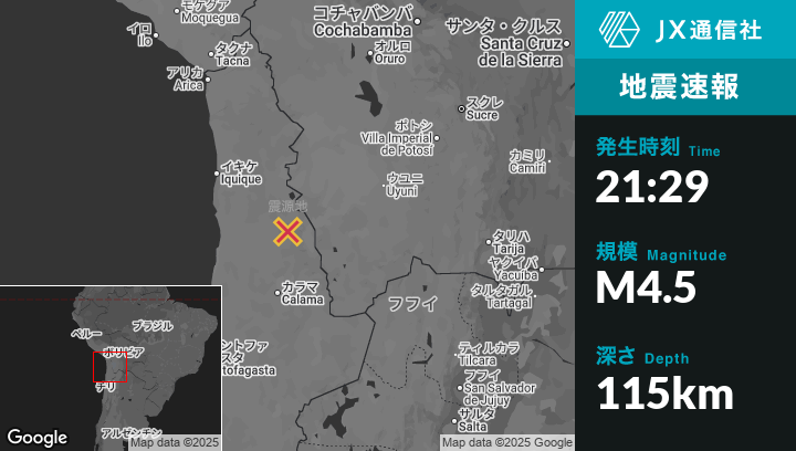 12月01日 21:29頃、チリのOllagüeから西49kmの地点でM4.5の地震がありました。
