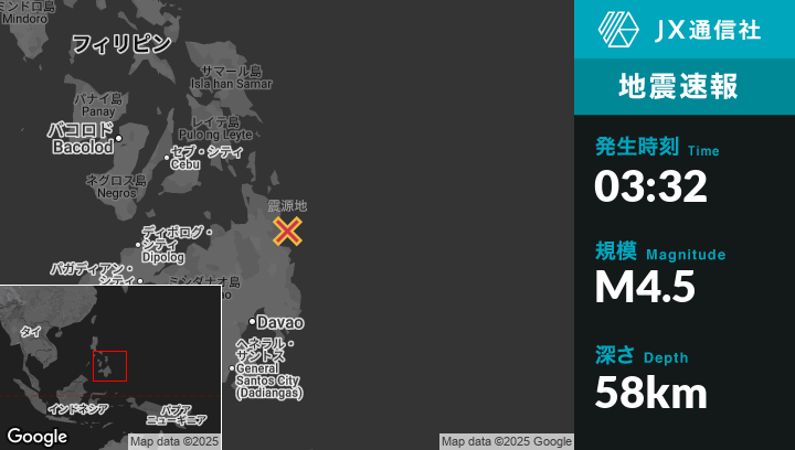 12月02日 03:32頃、フィリピンのLa Pazから東南東3kmの地点でM4.5の地震がありました。