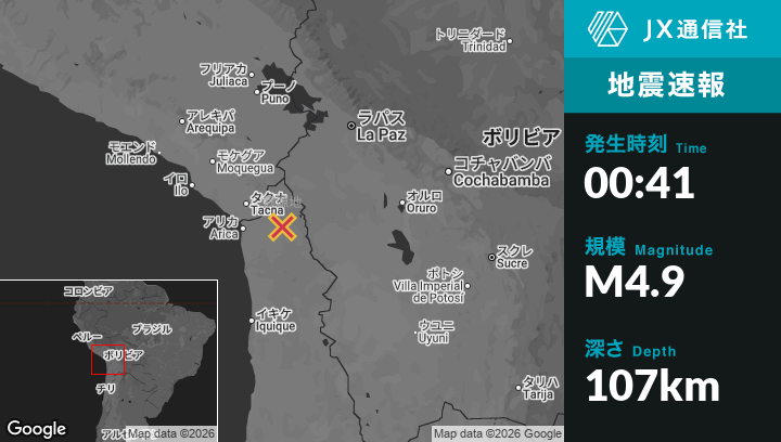 3月10日 00:41頃、ペルーのPalcaから南東77kmの地点でM4.9の地震がありました。