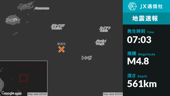 3月10日 07:03頃、トンガのHoumaから西北西249kmの地点でM4.8の地震がありました。