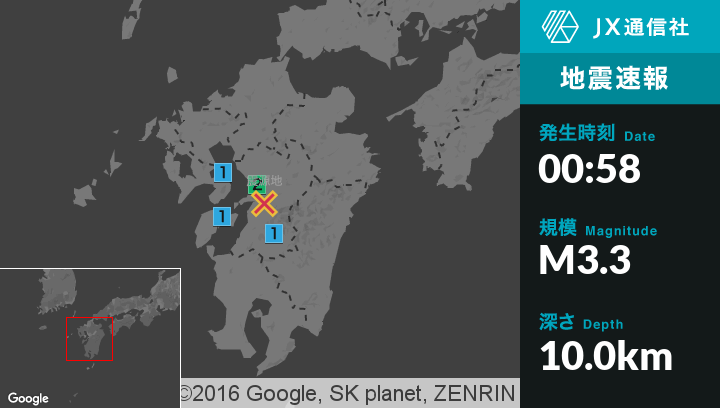 | 震度1 | 熊本県球磨, 熊本県天草・芦北, 長崎県島原半島, 鹿児島県薩摩 |