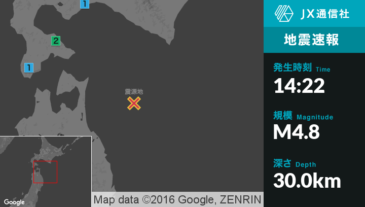 | 震度1 | 石狩地方南部, 渡島地方西部, 胆振地方中東部, 日高地方西部, 日高地方中部, 日高地方東部, 岩手県沿岸北部 |