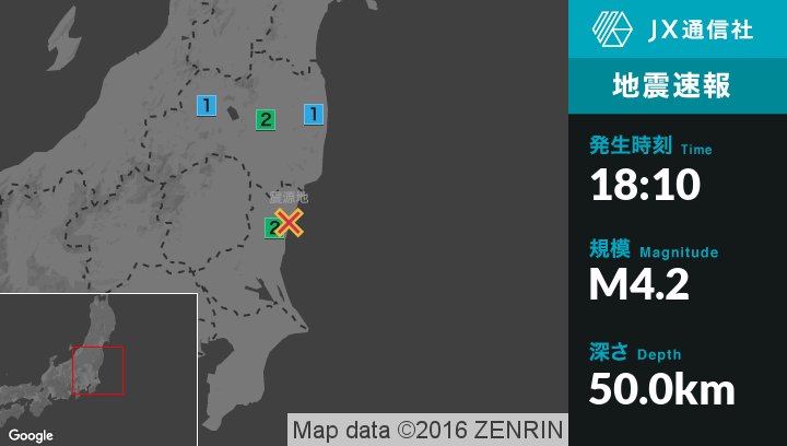 | 震度2 | 福島県中通り, 茨城県北部, 茨城県南部, 栃木県北部, 栃木県南部 |