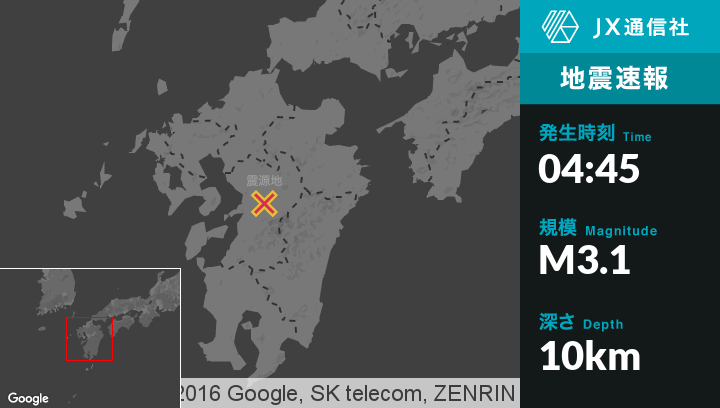 | 震度2 | 熊本中央区, 熊本東区, 熊本西区, 宇城市 |