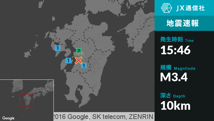| 震度1 | 宇土市, 宇城市, 熊本美里町, 甲佐町, 山都町, 氷川町, 水上村, 五木村, 球磨村, 水俣市, 上天草市, 芦北町, 大村市, 伊佐市 |