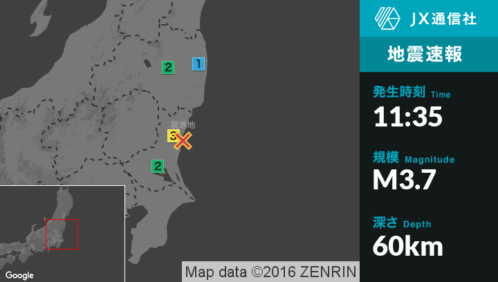 | 震度1 | 北茨城市, 那珂市, 茨城町, 大洗町, 下妻市, 取手市, 牛久市, つくば市, 茨城鹿嶋市, 潮来市, 稲敷市, かすみがうら市, 行方市, 鉾田市, 美浦村, 阿見町, 白河市, 田村市, 鏡石町, 泉崎村, 棚倉町, 玉川村, 古殿町, いわき市, 宇都宮市, 真岡市, 栃木さくら市, 那須烏山市, 下野市, 益子町, 市貝町, 芳賀町, 栃木那珂川町, 日光市, 大田原市, 香取市, 野田市, 成田市, 白井市 |