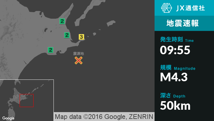 | 震度2 | 浜中町, 標茶町, 中標津町, 標津町, 別海町 |