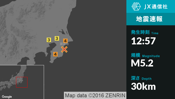 | 震度3 | 茂原市, 東金市, 山武市, 大網白里市, 九十九里町, 芝山町, 睦沢町, 長生村, 長柄町, 木更津市, 勝浦市, 鴨川市, 君津市, 富津市, 袖ケ浦市, 南房総市, 大多喜町, 御宿町, 鋸南町, 千葉中央区, 千葉稲毛区, 千葉若葉区, 千葉緑区, 千葉美浜区, 市原市, 四街道市, 東京千代田区, 東京江東区, 東京大田区, 横浜鶴見区, 横浜神奈川区, 横浜西区, 横浜中区, 横浜保土ケ谷区, 横浜港北区, 横浜戸塚区, 横浜旭区, 川崎川崎区, 川崎幸区, 川崎中原区 |