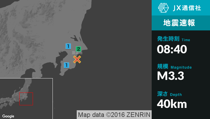| 震度1 | 茂原市, 東金市, 大網白里市, 一宮町, 睦沢町, 長柄町, 千葉中央区, 千葉緑区, 市原市, 勝浦市, いすみ市 |