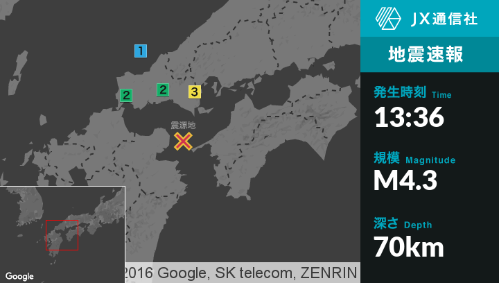 | 震度2 | 岩国市, 柳井市, 和木町, 上関町, 平生町, 宇部市, 山口市, 防府市, 下松市, 安芸高田市, 三原市, 広島安芸区, 呉市, 大竹市, 東広島市, 廿日市市, 江田島市, 府中町, 大崎上島町, 今治市, 上島町, 松山市, 宇和島市, 八幡浜市, 大洲市, 西予市, 内子町, 伊方町, 愛南町, 宿毛市, 行橋市, 熊本高森町, 豊後高田市, 国東市, 姫島村, 大分市, 臼杵市 |