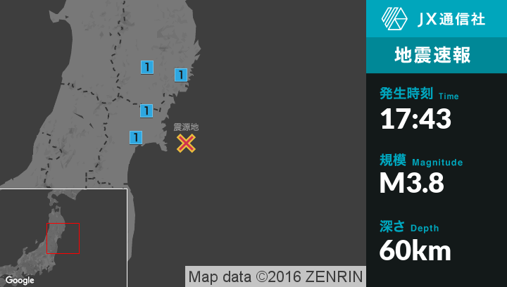 | 震度1 | 住田町, 一関市, 登米市, 大崎市, 涌谷町, 石巻市, 松島町, 女川町 |