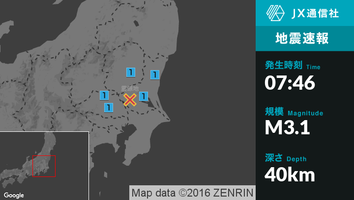 | 震度1 | 水戸市, 笠間市, 小美玉市, 土浦市, 茨城古河市, 石岡市, 取手市, つくば市, 筑西市, 坂東市, 稲敷市, かすみがうら市, 桜川市, 栃木市, 下野市, 久喜市, さいたま北区, さいたま浦和区, 春日部市, 宮代町 |