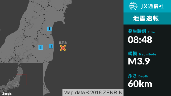 | 震度1 | 角田市, 岩沼市, 山元町, 白河市, 田村市, 南相馬市, 浪江町, 新地町 |