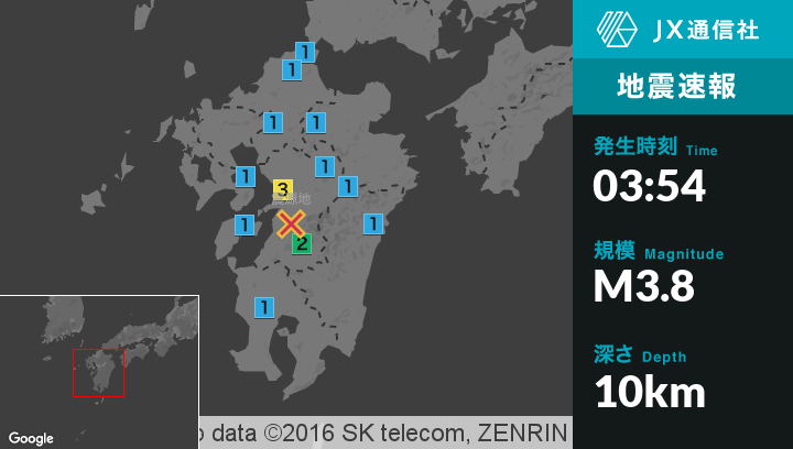 | 震度1 | 熊本中央区, 熊本東区, 熊本西区, 熊本北区, 山鹿市, 宇土市, 大津町, 菊陽町, 嘉島町, 益城町, 人吉市, 水上村, 五木村, 南阿蘇村, 上天草市, みやこ町, 嘉麻市, 久留米市, 八女市, 小郡市, 朝倉市, みやま市, 筑前町, 大刀洗町, 雲仙市, 南島原市, 日田市, 西都市, 宮崎都農町, 諸塚村, 椎葉村, 日之影町, 霧島市, 伊佐市 |