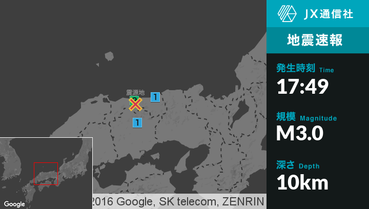 | 震度1 | 倉吉市, 湯梨浜町, 鳥取市, 鏡野町 |