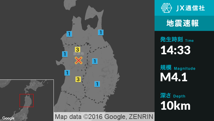 震度1大仙市, 秋田美郷町, 能代市, 潟上市, 三種町, 五城目町, 井川町, 秋田市, 弘前市, 平川市, 大鰐町, 八戸市, 十和田市, 五戸町, 青森南部町, 階上町, 二戸市, 九戸村, 西和賀町