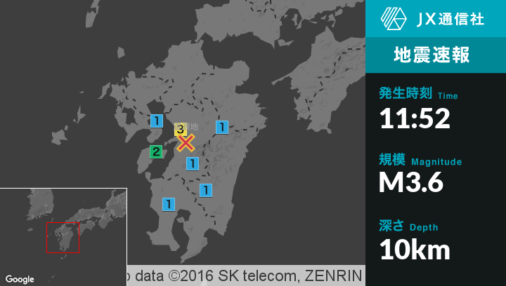 | 震度2 | 熊本西区, 熊本南区, 宇土市, 宇城市, 熊本美里町, 氷川町, 上天草市 |