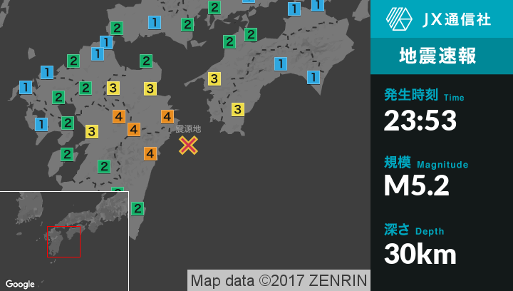 | 震度4 | 熊本高森町, 佐伯市, 豊後大野市, 延岡市, 宮崎美郷町, 高千穂町 |