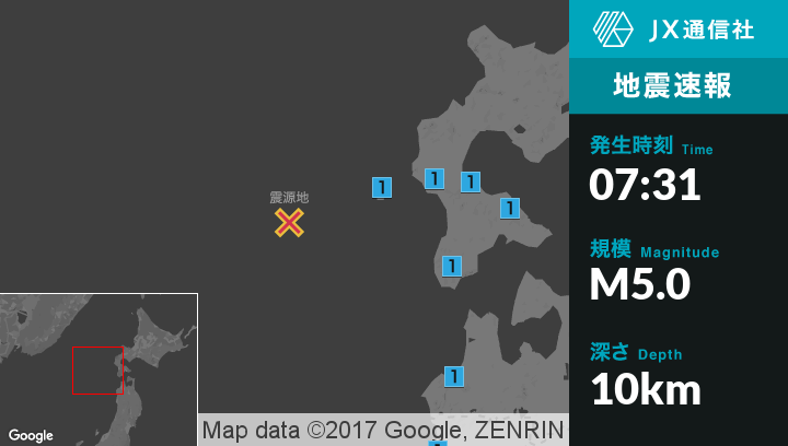 | 震度1 | 八雲町, 函館市, 福島町, 木古内町, 上ノ国町, 乙部町, せたな町, 奥尻町, 深浦町, 能代市 |