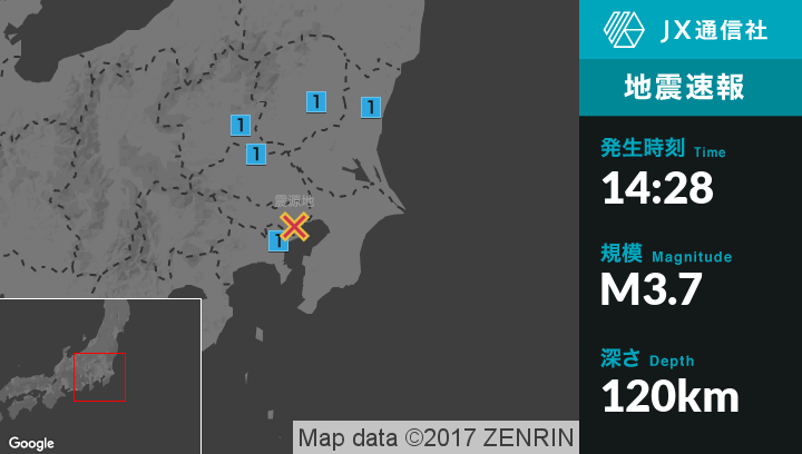 | 震度1 | 水戸市, 笠間市, 宇都宮市, 佐野市, 下野市, 桐生市, 渋川市, 加須市, 三浦市 |