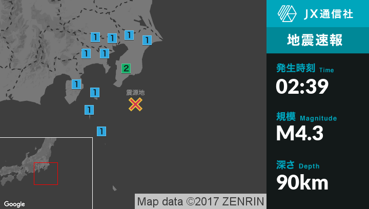 | 震度1 | 館山市, 木更津市, 鴨川市, 君津市, 富津市, 南房総市, 大多喜町, 一宮町, 長南町, 千葉美浜区, 市原市, 東京千代田区, 東京中央区, 東京新宿区, 東京江東区, 東京品川区, 東京世田谷区, 東京渋谷区, 東京中野区, 国分寺市, 伊豆大島町, 東京利島村, 新島村, 三宅村, 御蔵島村, 横浜中区, 横浜緑区, 川崎川崎区, 川崎中原区, 川崎宮前区, 横須賀市, 平塚市, 茅ヶ崎市, 三浦市, 秦野市, 厚木市, 中井町, 湯河原町, 熱海市, 東伊豆町 |