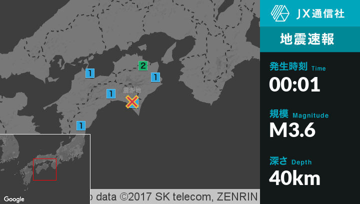 | 震度1 | 美馬市, つるぎ町, 那賀町, 牟岐町, 美波町, 海陽町, 今治市, 四国中央市, 室戸市, 安芸市, 東洋町, 奈半利町, 安田町, 高知市, 高知香南市, 香美市, 中土佐町 |