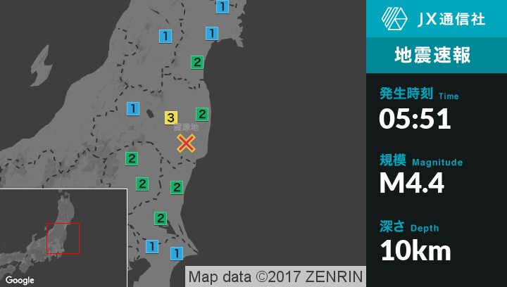 | 震度2 | 白河市, 田村市, 泉崎村, 中島村, 棚倉町, 矢祭町, 鮫川村, 石川町, 玉川村, 平田村, いわき市, 楢葉町, 岩沼市, 水戸市, 日立市, 常陸太田市, 高萩市, 笠間市, ひたちなか市, 常陸大宮市, 那珂市, 小美玉市, 茨城町, 城里町, 東海村, 大子町, 土浦市, 石岡市, 常総市, つくば市, かすみがうら市, 桜川市, 行方市, 鉾田市, 美浦村, 大田原市, 宇都宮市, 市貝町, 芳賀町, 邑楽町 |
