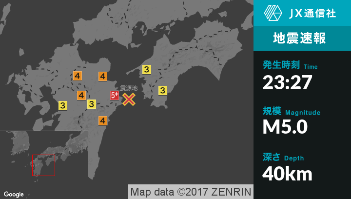 | 震度1 | 日田市, 玖珠町, 中津市, 熊本小国町, 熊本東区, 熊本西区, 南関町, 大津町, 菊陽町, 嘉島町, 甲佐町, 湯前町, 水上村, 五木村, 山江村, 水俣市, 上天草市, 西米良村, 諸塚村, 宮崎美郷町, 大洲市, 内子町, 松野町, 愛媛鬼北町, 今治市, 西条市, 上島町, 松山市, 伊予市, 東温市, 久万高原町, 土佐清水市, 四万十市, 四万十町, 三原村, 高知市, 高知香南市, 広島中区, 広島西区, 広島安佐南区, 広島安佐北区, 広島安芸区, 呉市, 大竹市, 東広島市, 廿日市市, 江田島市, 海田町, 大崎上島町, 安芸高田市, 三原市, 尾道市, 岩国市, 光市, 周防大島町, 田布施町, 平生町, 下関市, 宇部市, 山陽小野田市, 山口市, 防府市, 下松市, 周南市, 八女市, 筑後市, うきは市, 朝倉市, 大木町, 新宮町, 北九州若松区, 北九州八幡東区, 行橋市, 豊前市, 中間市, 水巻町, みやこ町, 上毛町, 築上町, 飯塚市, 嘉麻市, 添田町, 佐賀市, 小城市, 吉野ヶ里町, 阿久根市, 薩摩川内市, 姶良市, 鹿屋市, 錦江町, 浜田市, 益田市, 大田市, 川本町, 諫早市, 雲仙市, 南島原市 |