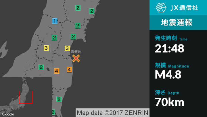 | 震度3 | 福島市, 郡山市, 白河市, 須賀川市, 二本松市, 福島伊達市, 本宮市, 桑折町, 国見町, 川俣町, 大玉村, 鏡石町, 天栄村, 泉崎村, 中島村, 矢吹町, 石川町, 玉川村, 浅川町, 古殿町, 三春町, 小野町, いわき市, 福島広野町, 楢葉町, 川内村, 双葉町, 浪江町, 葛尾村, 白石市, 名取市, 角田市, 岩沼市, 大河原町, 柴田町, 宮城川崎町, 丸森町, 亘理町, 山元町, 米沢市, 南陽市, 高畠町 |