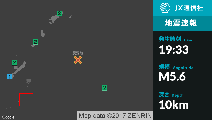 | 震度2 | 鹿児島十島村, 奄美市, 瀬戸内町, 天城町, 与論町, 名護市, 国頭村, 今帰仁村, 本部町, 恩納村, 北大東村 |