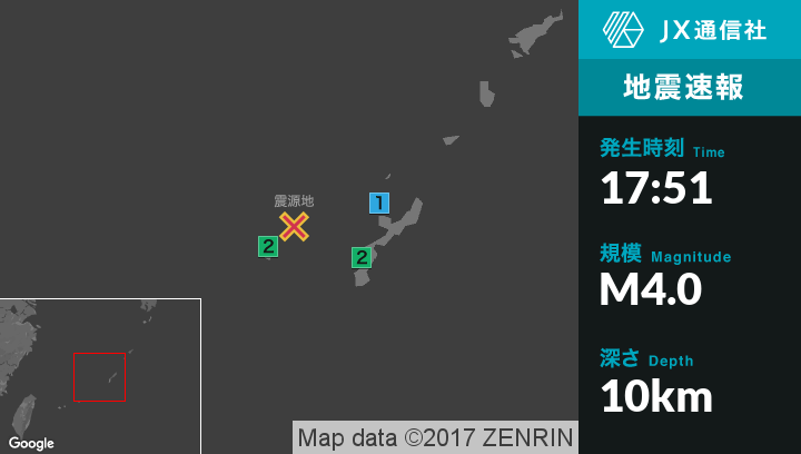 | 震度1 | 那覇市, 宜野湾市, 沖縄市, 豊見城市, 中城村, 西原町, 渡嘉敷村, 座間味村, 八重瀬町, 恩納村 |