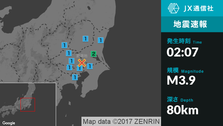 | 震度1 | 茨城古河市, 石岡市, 下妻市, 常総市, 取手市, 牛久市, つくば市, 筑西市, 坂東市, 稲敷市, かすみがうら市, 桜川市, 行方市, つくばみらい市, 水戸市, 常陸太田市, 笠間市, 常陸大宮市, 小美玉市, 城里町, 宇都宮市, 足利市, 栃木市, 佐野市, 真岡市, 下野市, 茂木町, 野木町, 桐生市, 館林市, 邑楽町, 熊谷市, 加須市, 本庄市, 東松山市, 久喜市, 滑川町, 吉見町, 埼玉美里町, さいたま浦和区, 春日部市, 草加市, 新座市, 幸手市, 宮代町, 杉戸町, 野田市, 習志野市, 柏市, 東京千代田区, 東京新宿区, 東京品川区, 東京渋谷区, 東京中野区, 東京杉並区, 東京北区, 東京練馬区, 東京足立区, 東京江戸川区, 八王子市, 武蔵野市, 三鷹市, 調布市, 小平市, 東大和市, 西東京市, 横浜鶴見区, 横浜神奈川区, 横浜中区, 横浜保土ケ谷区, 横浜磯子区, 横浜戸塚区, 横浜港南区, 横浜旭区, 大和市 |