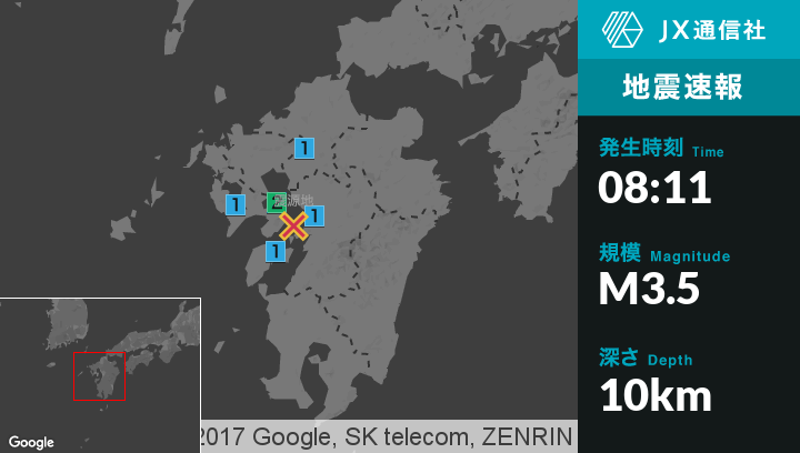 | 震度1 | 諫早市, 大牟田市, みやま市, 熊本西区, 玉名市, 菊池市, 宇土市, 宇城市, 山都町, 上天草市 |