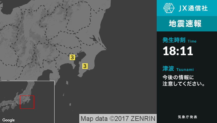 | 震度3 | 千葉県南部, 神奈川県東部 |
