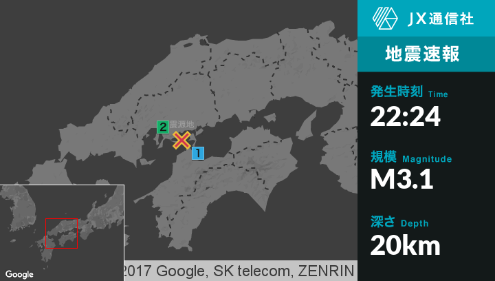 | 震度1 | 広島安芸区, 東広島市, 熊野町, 坂町, 大崎上島町, 今治市 |