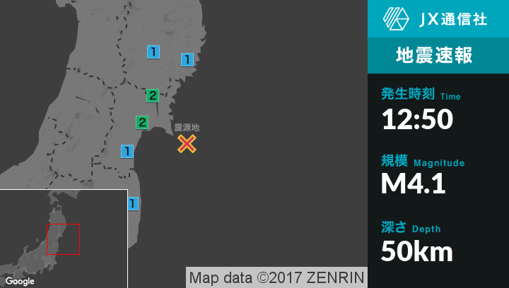 | 震度2 | 登米市, 涌谷町, 石巻市, 女川町 |