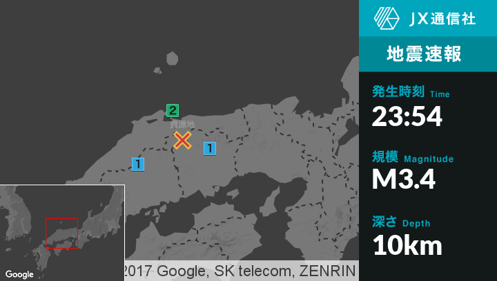 | 震度1 | 江府町, 新見市, 真庭市, 新庄村, 庄原市 |