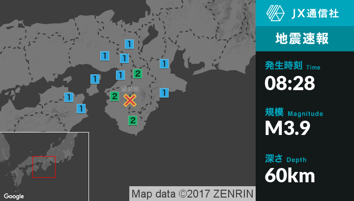 | 震度1 | 大和高田市, 大和郡山市, 天理市, 橿原市, 五條市, 香芝市, 葛城市, 山添村, 平群町, 三郷町, 斑鳩町, 奈良川西町, 三宅町, 田原本町, 御杖村, 上牧町, 王寺町, 広陵町, 河合町, 吉野町, 大淀町, 下市町, 黒滝村, 天川村, 十津川村, 下北山村, 東吉野村, 海南市, 橋本市, 有田市, 御坊市, かつらぎ町, 高野町, 湯浅町, 和歌山広川町, 由良町, みなべ町, 上富田町, 古座川町, 松阪市, 名張市, 伊賀市, 尾鷲市, 熊野市, 紀宝町, 和束町, 南山城村, 大阪生野区, 大阪東住吉区, 豊中市, 富田林市, 河内長野市, 大阪太子町, 神戸長田区, 明石市, 洲本市, 南あわじ市, 淡路市, 徳島市, 那賀町 |