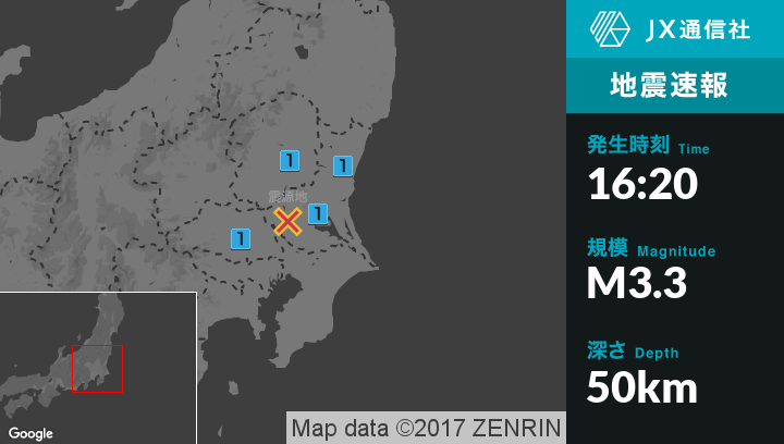 | 震度1 | 水戸市, 笠間市, 常陸大宮市, 小美玉市, 城里町, 土浦市, 石岡市, 下妻市, 筑西市, 坂東市, 桜川市, 宇都宮市, 栃木市, 真岡市, 下野市, 宮代町 |