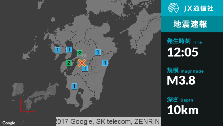 | 震度1 | 熊本西区, 熊本南区, 熊本北区, 菊池市, 宇土市, 御船町, 嘉島町, 益城町, 甲佐町, 山都町, 氷川町, 水俣市, 天草市, 芦北町, 五木村, 球磨村, あさぎり町, 長崎市, 諫早市, 雲仙市, 南島原市, 西都市, 椎葉村, 阿久根市, 鹿児島出水市, 伊佐市, 長島町 |
