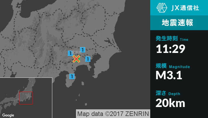 | 震度1 | 相模原緑区, 相模原南区, 秦野市, 厚木市, 伊勢原市, 南足柄市, 中井町, 松田町, 山北町, 清川村, 横浜港南区, 横浜泉区, 横浜青葉区, 川崎麻生区, 平塚市, 藤沢市, 茅ヶ崎市, 三浦市, 大磯町, 町田市, 小金井市, 国分寺市, 上野原市, 道志村, 熱海市 |