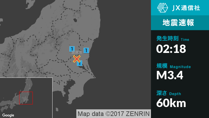| 震度1 | 笠間市, 東海村, 土浦市, 筑西市, かすみがうら市, 桜川市, 宇都宮市, 栃木市, 真岡市, 下野市, 益子町 |