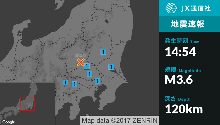 | 震度1 | 土浦市, 坂東市, 栃木市, 加須市, 東松山市, 久喜市, さいたま北区, 桶川市, 宮代町, 東京千代田区, 東京中野区, 山梨北杜市, 大月市 |