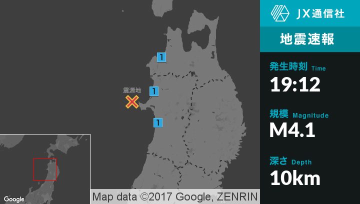 | 震度1 | 深浦町, 能代市, 男鹿市, 潟上市, 井川町, 秋田市 |