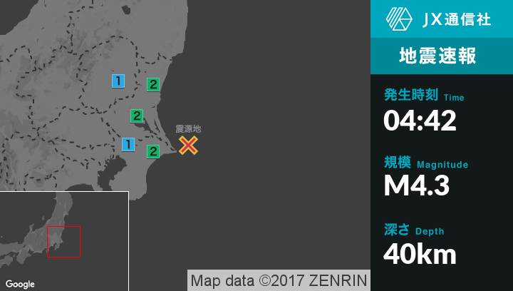 | 震度1 | 水戸市, 日立市, 笠間市, 常陸大宮市, 小美玉市, 茨城町, 大洗町, 城里町, 東海村, 土浦市, 石岡市, 龍ケ崎市, 取手市, 牛久市, つくば市, かすみがうら市, 桜川市, 行方市, 鉾田市, 美浦村, 東金市, 山武市, 神崎町, 多古町, 東庄町, 九十九里町, 芝山町, 横芝光町, 千葉稲毛区, 野田市, 成田市, 千葉佐倉市, 市原市, 八千代市, 印西市, 白井市, 富里市, 栄町, 真岡市, 下野市, 芳賀町 |