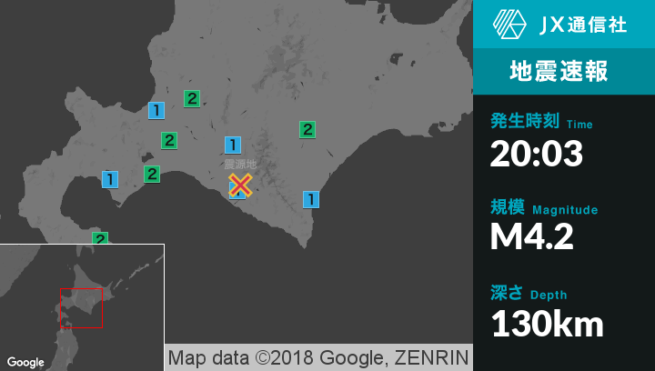 | 震度2 | 千歳市, 函館市, 南幌町, 厚真町, むかわ町, 浦幌町, 階上町 |